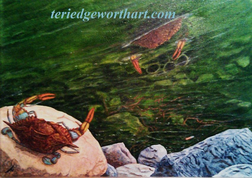 This piece was recently donated to The Maryland Coastal Bays Program, located at 8219 Stephan Decatur Highway, Berlin, Maryland. It depicts a crab getting caught in a plastic six pack holder and a cigarette but floating in the water, and is a reminder to us all to take care of our waterways, the beach, the bays and the rivers and creeks that connect us all. Mention this piece when ordering your next painting and Teri will give you the client a "crabby" discount on any purchase and she will also donate ten percent of the sale to help support the MDCP!
